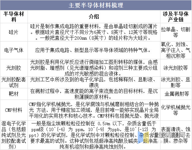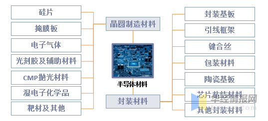 半导体原料席卷晶圆创造原料和封装原料。个中晶圆创造原料席卷硅片、掩模版、电子气体、光刻胶、CMP掷光原料、湿电子化学品、靶材等,封装原料席卷封装基板、引线框架、键合丝、包封原料、陶瓷基板、芯片粘结原料和其他封装原料。