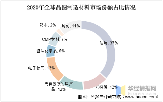 2021年团体的原料发售额抵达643亿美元,个中晶圆前端创造闭键用到的原料抵达404亿美元(占创造本钱的15~20%),后端封测闭键用到的原料抵达239亿美元。晶圆创造原料要紧席卷硅片、光掩模、光刻胶及辅帮原料、CMP掷光原料、工艺化学品、靶材、电子特气等。细分晶圆创造而言,数据统计,2020年环球晶圆创造原料墟市中,晶圆创造原料墟市中占比最高的材的硅片墟市份额为37%。