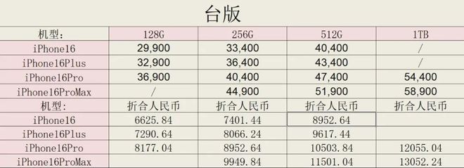 最贵的1TB版iPhone16ProMax,售价是58900元新台币,折合公民币约莫为13052元。固然说比港版贵了约莫600元,但要比国行版低贱了约莫900元驾驭。