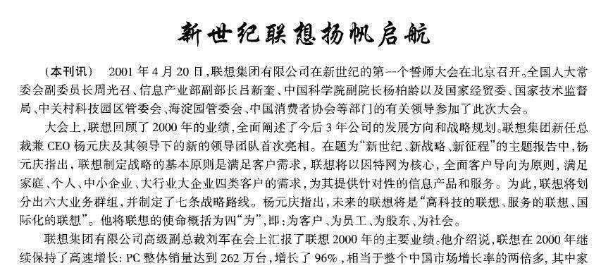 杨元庆接掌联思后也是走技工贸途径年前后,杨元庆已开端实践刻意联思运作,并正在2004年接任了联思董事长。而正在2001年,杨元庆正式提出了“高科技的联思,任事的联思,国际化的联思”的企业策略,并且联思不只是喊标语,实践也是有进入的